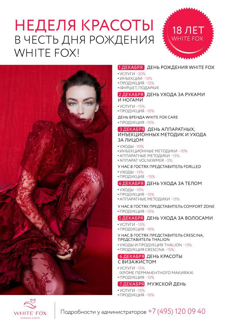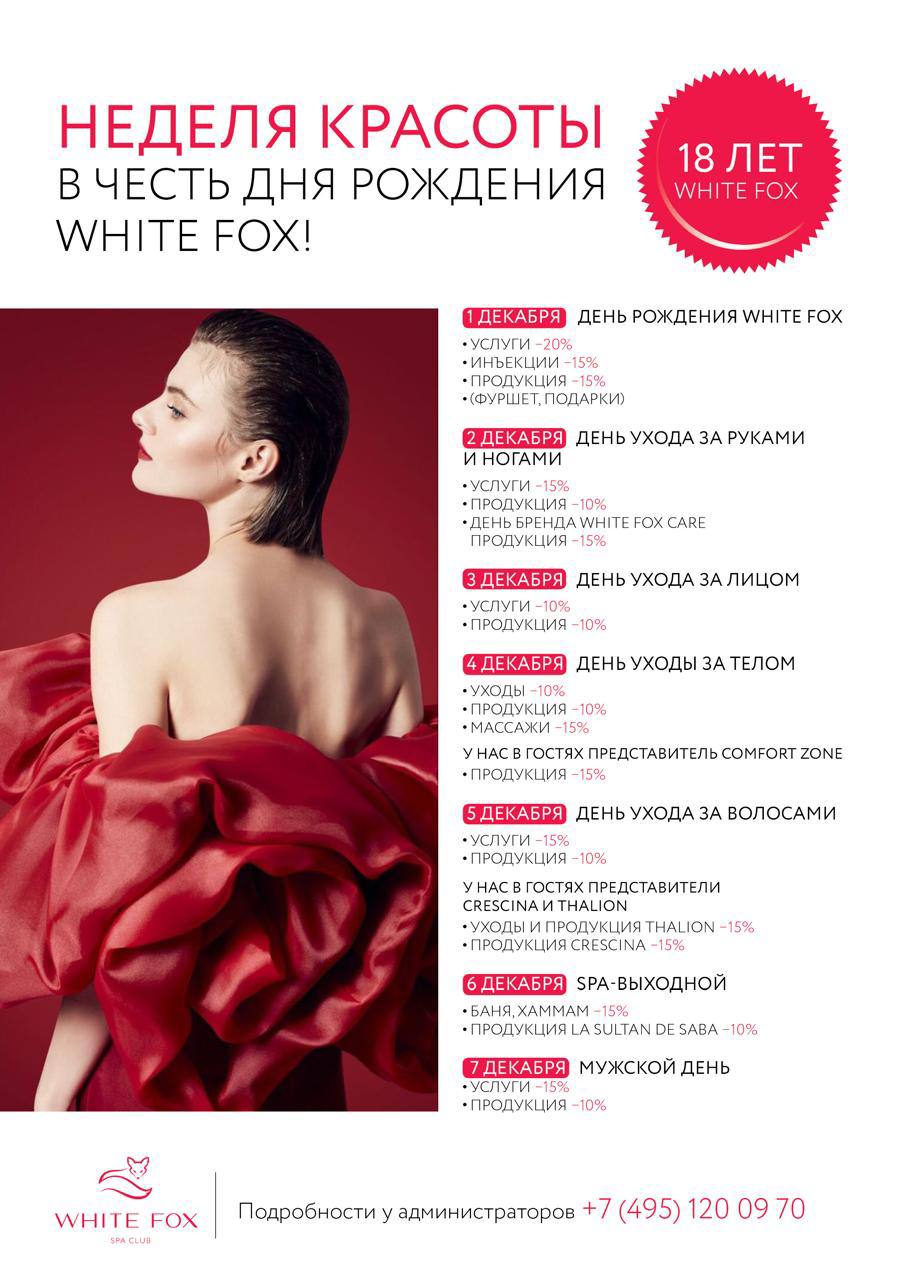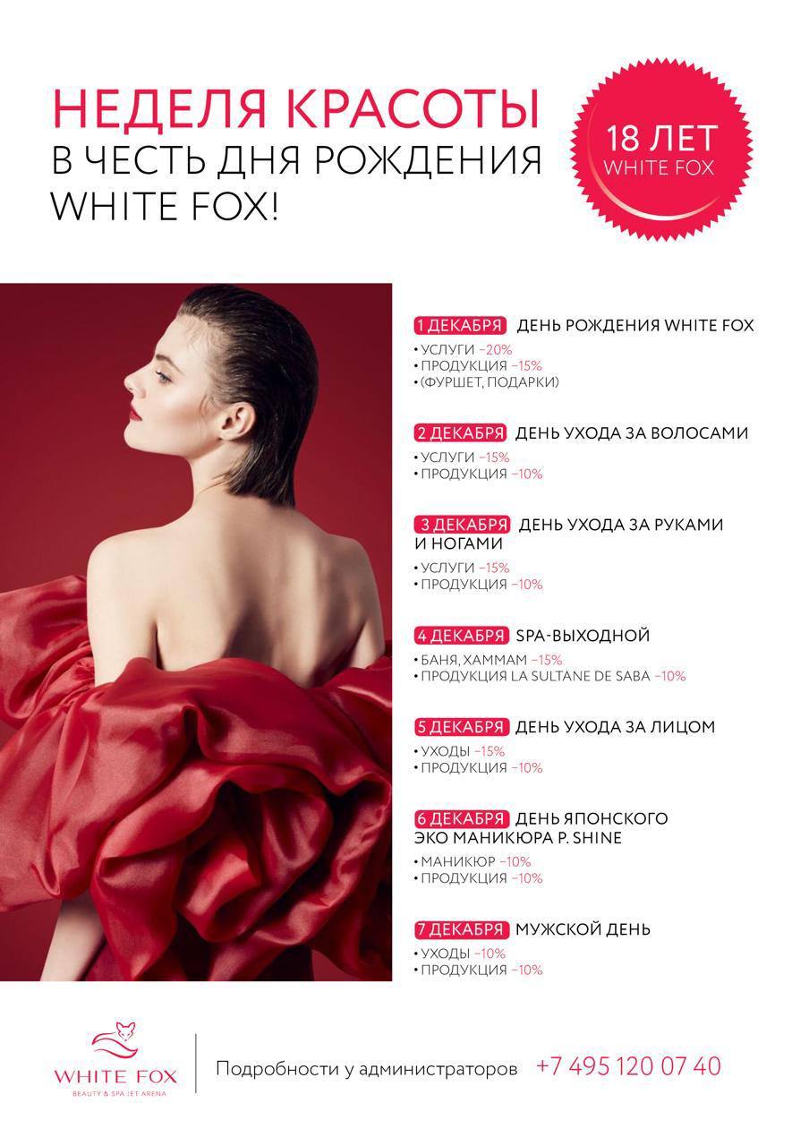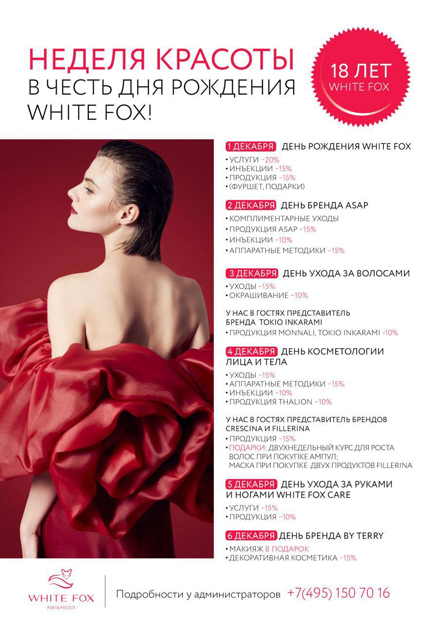 1 декабря центрам красоты и косметологии White Fox исполняется 18 лет! Возраст когда уже можно все. В честь своего 18-летия White Fox устраивают праздник в стиле «18+» и ждут всех в центрах красоты и косметологии на особое событие.