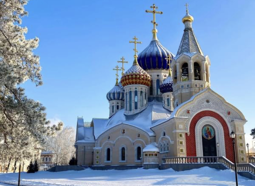 Московский Покровский собор вдохновил строителей своими яркими маковками-луковками. Строили храм питерские умельцы из "Гильдии мастеров". Купола уникальны, они выполнены по новой современной технологии - из фарфоровой "чешуи". Фарфоровые купола не подвержены выцветанию, они никогда не потускнеют и всегда будут радовать глаз своими яркими красками. Питерские мастера запатентовали свою уникальную технологию по изготовлению фарфоровых куполов, и есть надежда, что таких нарядных храмов в мире станет больше.