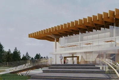 Активный рельеф и наличие естественного водоема определили композиционное решение и позволили организовать проход к зданию на уровень второго этажа по протяженному мостику. После завершения работ на территории под открытым небом заработают открытые теннисные корты и спортивная площадка для стритбола. Вокруг здания высадят кустарники, деревья, разобьют газоны.