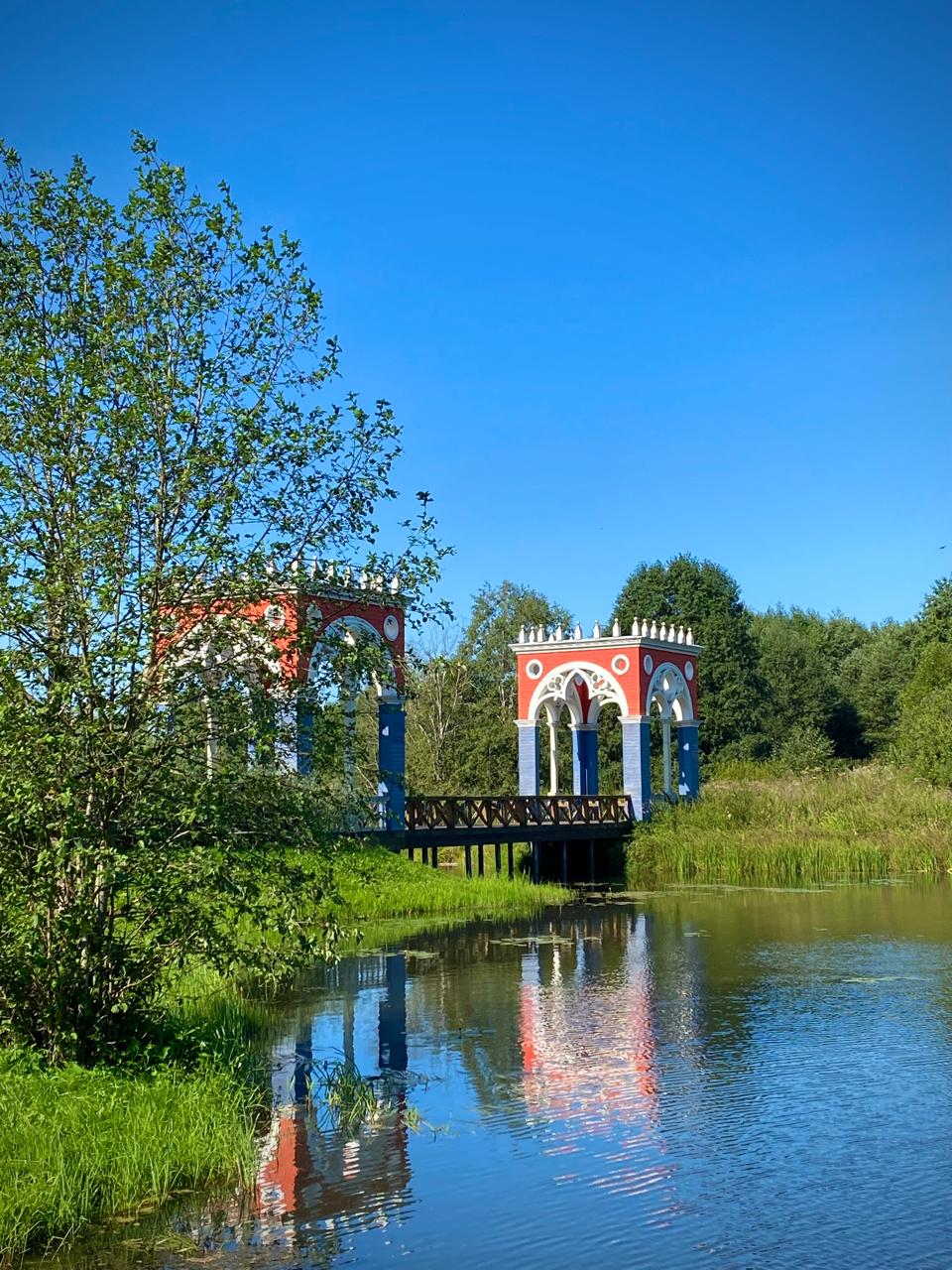 Возрожденный английский парк, где есть воздушные белые беседки, пруд с венецианским мостиком. Тут настоящее имение: хозяйственные постройки и ферма, производящая продукты, которые можно попробовать в трактире. Рядом конюшня, сыроварня, аптекарский огород, мастерские.