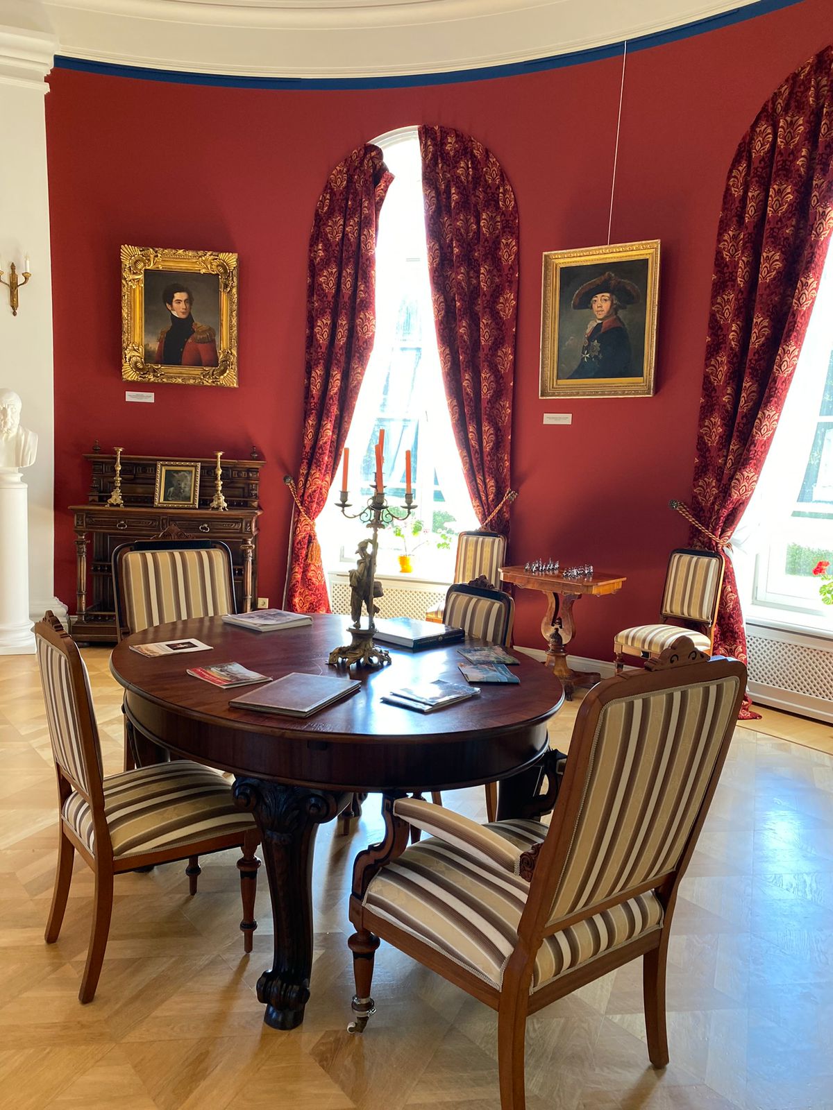 Двухэтажный дом с двумя флигелями огромен – три тысячи квадратных метров. При входе посетителям выдают музейные бахилы - однако на том и заканчивается атмосфера музея: на антикварной мебели можно сидеть, нигде нет никаких ограждений и запрещений. Никаких веревочек и шипящих бабушек. Полное ощущение живого дома - на столах разложены книги по искусству и архитектуре, на подоконниках цветет красная герань. Хозяева живут тут же, в усадьбе, в этом же доме. По нему есть часовая экскурсия с шикарным экскурсоводом, иногда экскурсии водит сама хозяйка - Маргарита Владимировна.