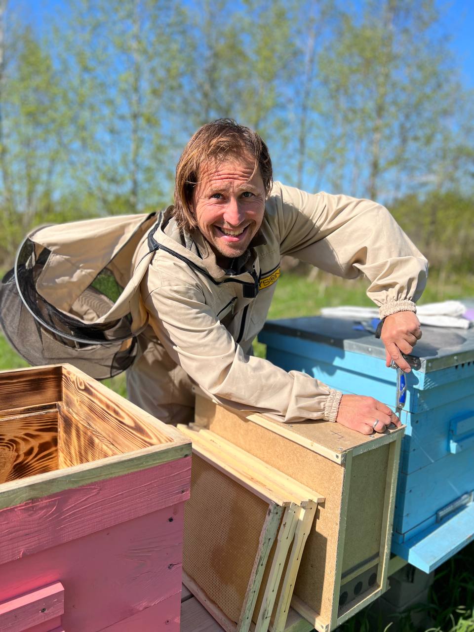 Кроме овец у нас ещё есть козы зааненской породы, некоторый количество коров джерсийской породы, куры, симпатичные чёрные поросята и небольшой зоопарк в котором есть утки, гуси, лебеди, кролики, альпаки. Еще мы выращиваем овощи, есть небольшие плантации голубики и клубники. Своя пасека – мед у нас классный!