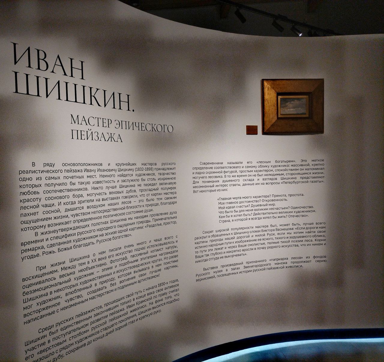 Крупнейшая выставка работ Ивана Шишкина из собрания Русского музея открылась 6 марта в Звенигородском музее. 40 живописных полотен великого русского пейзажиста Ивана Ивановича Шишкина (1832-1898) представлены посетителям. Картины расположены в хронологическом порядке: от первых законченных полотен до величественных пейзажей конца 1890-х годов. Такой подход раскрывает особенности художественного почерка мастера и позволяет проследить его творческий путь. Дополнением к живописным полотнам стала мультимедийная зона, которая позволяет посетителям буквально погрузиться в мир великого пейзажиста.