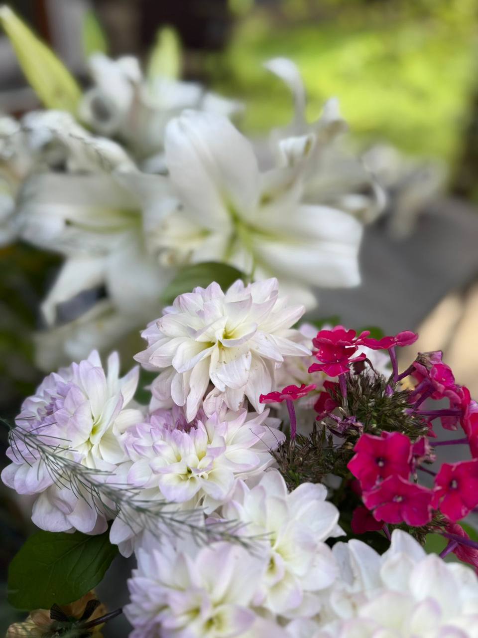Лучшая бабушка стоит у госпиталя Звезда на Ильинском шоссе - купили огромный букет лилий 400₽, георгины 1000₽, есть подсолнухи, ромашки, флоксы.