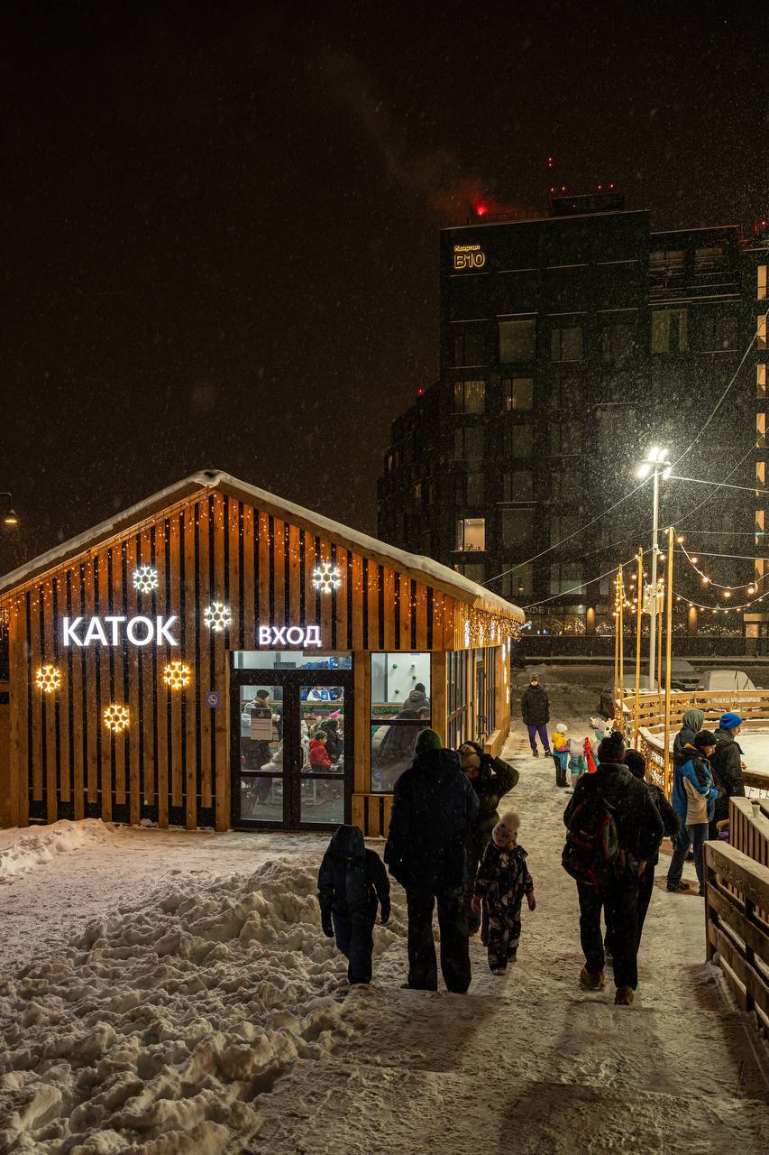Начать стоит с посещения главной зимней локации — уютного открытого катка в самом сердце СберСити. Это идеальное место и для новичков, и для опытных фигуристов.
